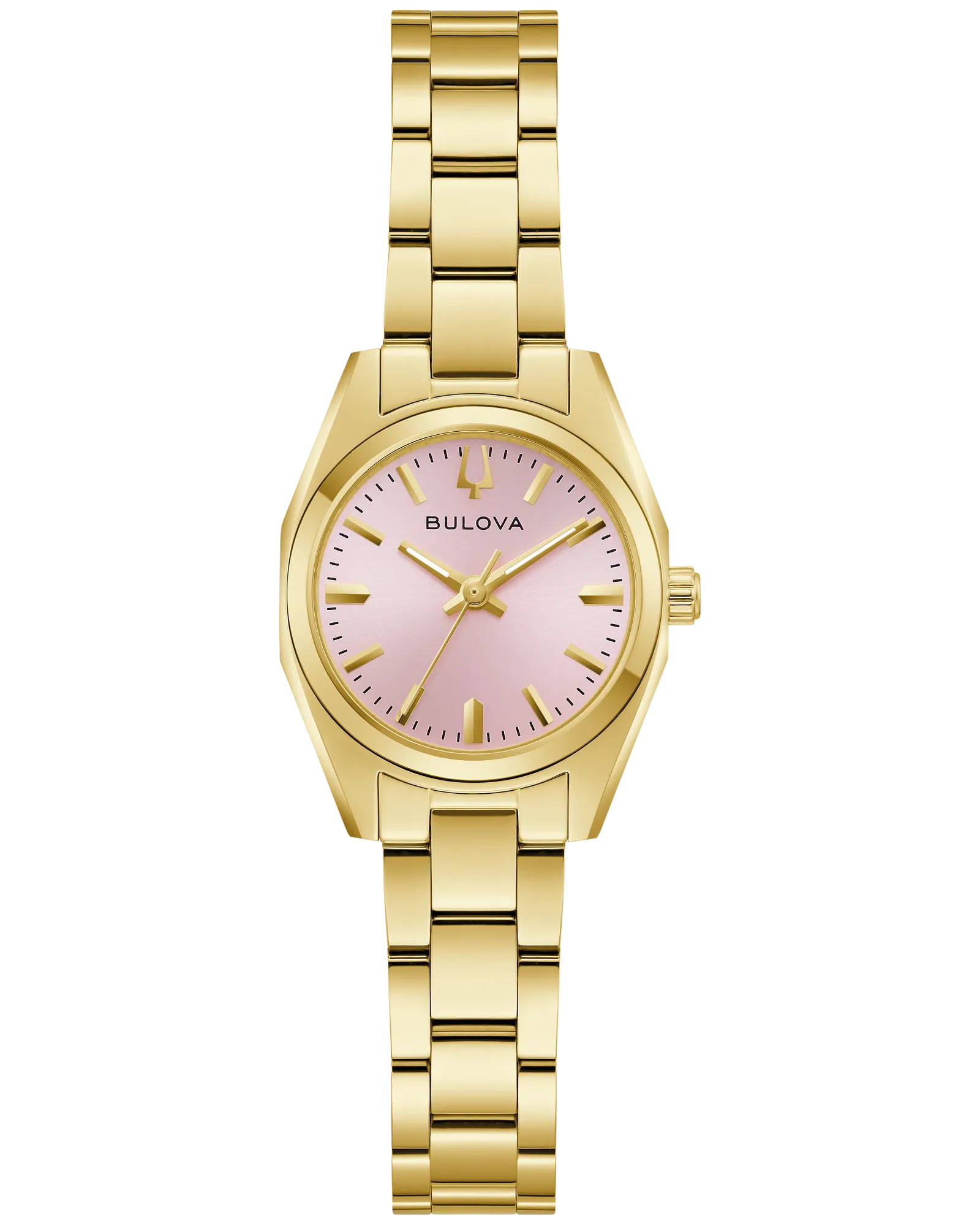 Defined by exceptional quality and sophisticated aesthetics, the Bulova ladies’ Surveyor is the quintessential modern timepiece updated with a mini 23mm case. Sculpted edges and faceting distinguish the gold-tone stainless steel case, with polished and brushed finishing, a flat sapphire crystal, and a matching 3-link gold-tone stainless steel bracelet with a push-button deployant clasp and easy-release latched spring bars. The radiant pink dial has a sunburst finish and gold-tone accents and hands with luminescent fill. For those with a discerning eye for refined luxury, this Bulova women’s timepiece is the perfect everyday companion.